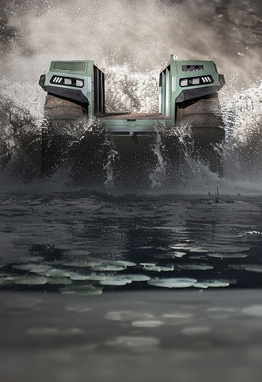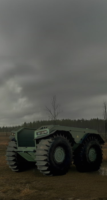 Amphibious all-terrain robotic platform with patented ultra-low-pressure tyres and payload capacity of up to 1,700 kg for demanding military missions.
